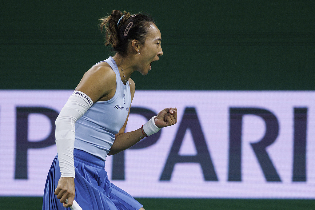 △美国当地时间2025年3月11日,印第安维尔斯1000赛中对阵科斯秋克的郑钦文。